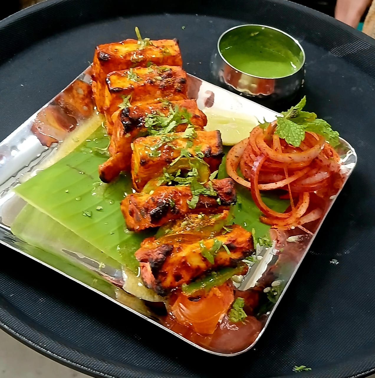 Cubes of paneer grilled with spice and love—a vegetarian delight.